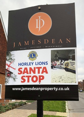 In the evenings of the weeks leading up to Christmas we also escort him, in his sleigh, along many of the roads around Horley. Whilst this is an exciting time for the children it is equally an opportunity to raise much needed funds to assist those less fortunate than ourselves, so if able please give generously. Many of the roads are busy and stopping to talk to the children could be dangerous so on some routes the Estate Agents James Dean have kindly agreed to place Santa Stops Boards at suitable locations. We ask that if you live in the vicinity of one of these you take your children to these points where Father Christmas will be pleased to talk to them.